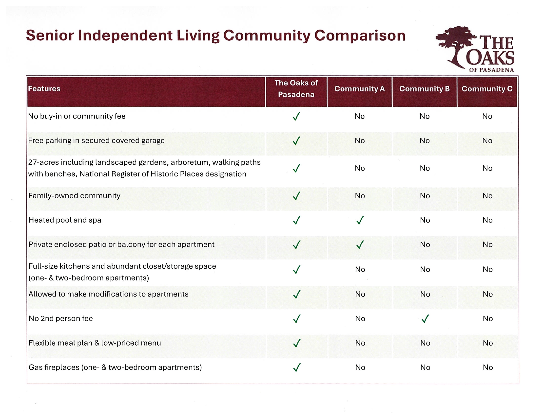Why choose The Oaks of Pasadena? Click below to see how we stack up against the competition: